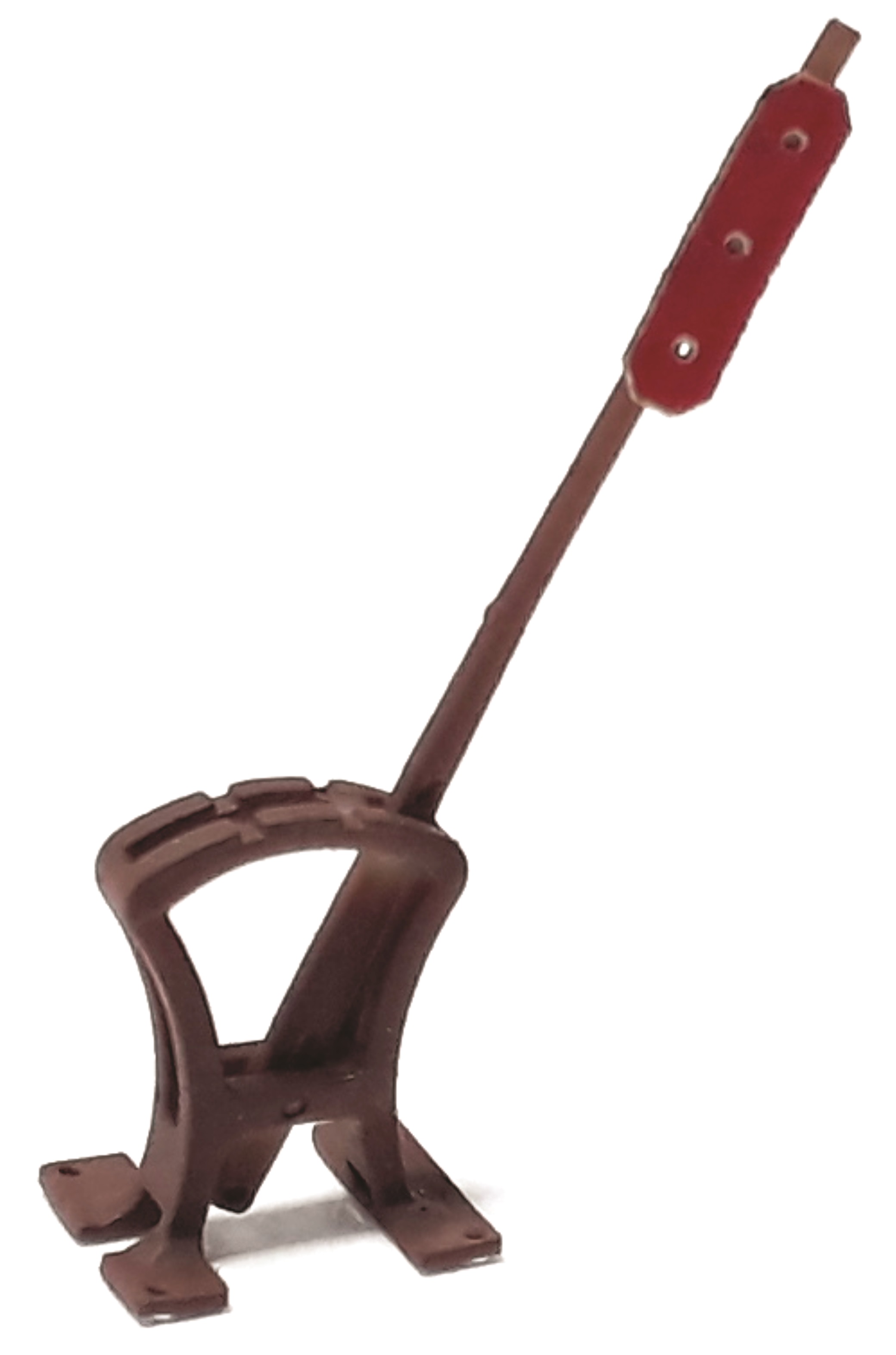 Haste em trilho níquel silver code 80 (tratado com oxidação a frio, posteriormente pintado e envelhecido), travessa em madeira com finos detalhes nos isoladores.